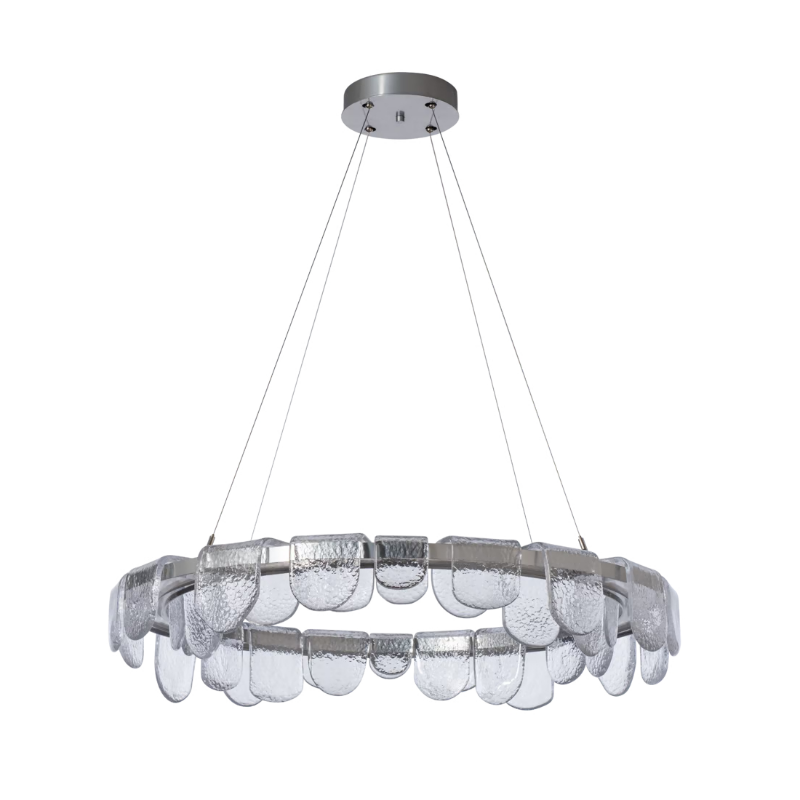 A riverbed of light. Stunning heavily-textured, clear poured artisanal glass in varying sizes are formed and shaped, then positioned on a round LED light-guide platform to stunning visual effect. Inspired by the cold icy streams of Vermont, adorned with ice-covered rocks and boulders, designer Andy Morter envisioned the Riverbed Collection to be like the frozen stones set along the river’s edge.