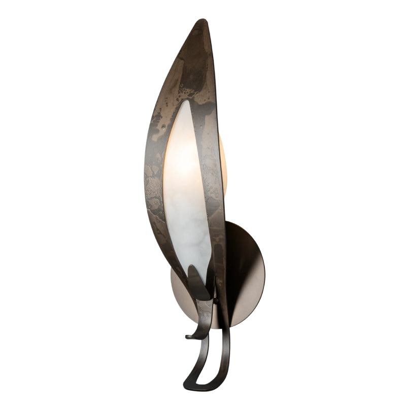 Hand-forged and beautifully shaped by Vermont artisans, the Parasol displays the work of our makers through the texture and personality that steel only achieves in the fires of the forge at more than 1800ºF. A piece of white art glass is nestled in the curve of the sconce's upward reach. According to HF designer Jason Hancock, a "milky" candelabra bulb is an ideal choice.