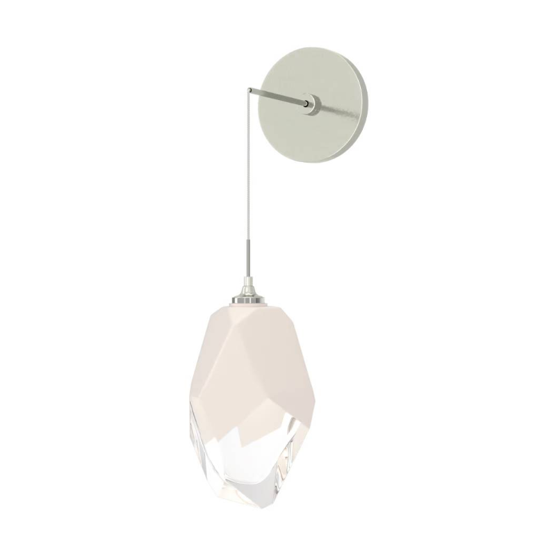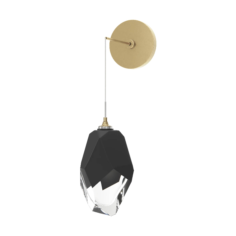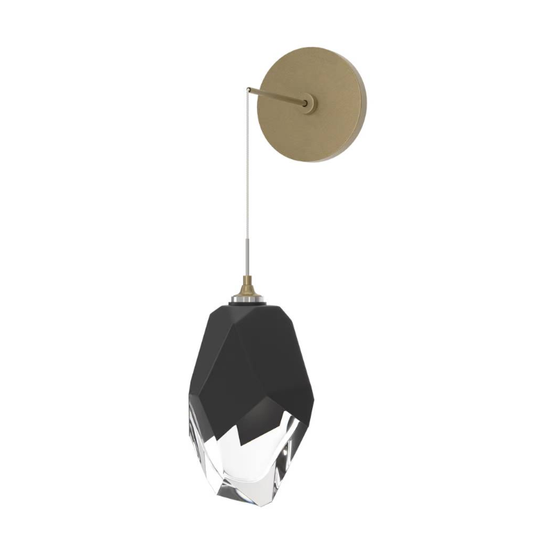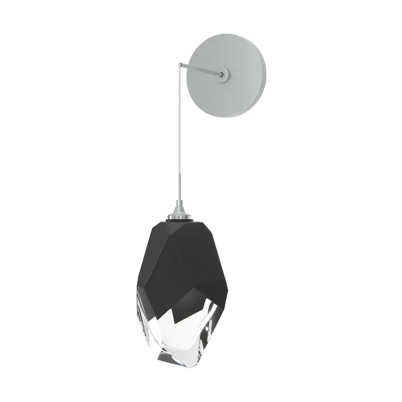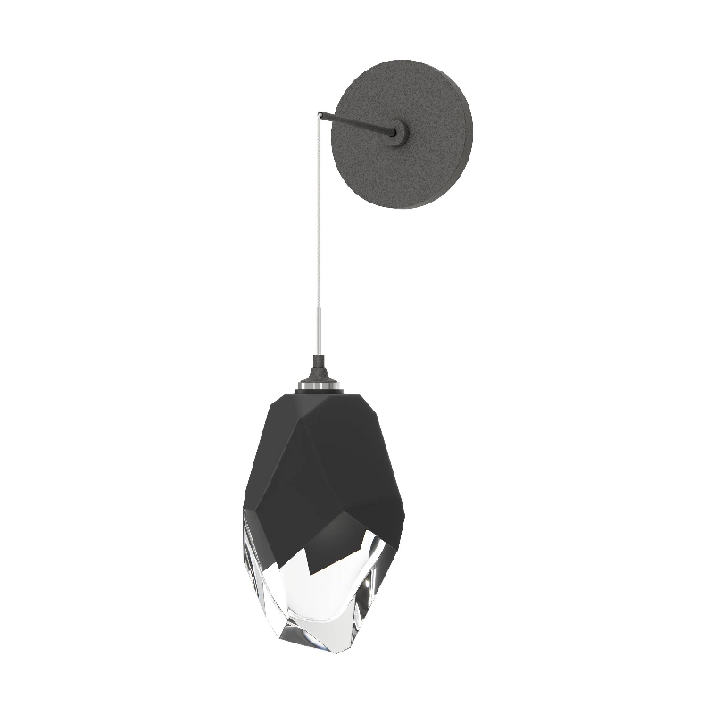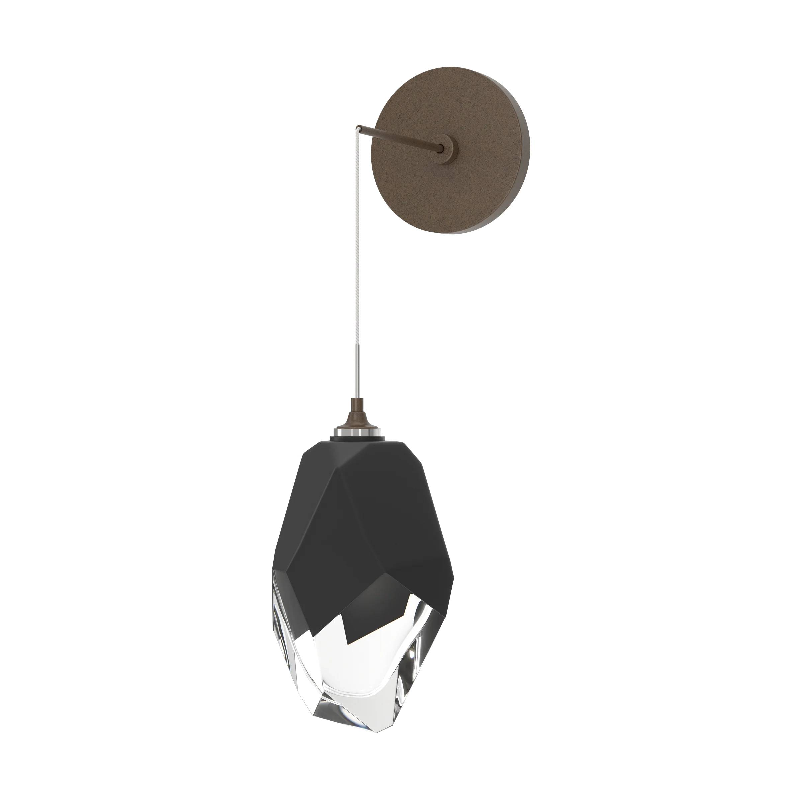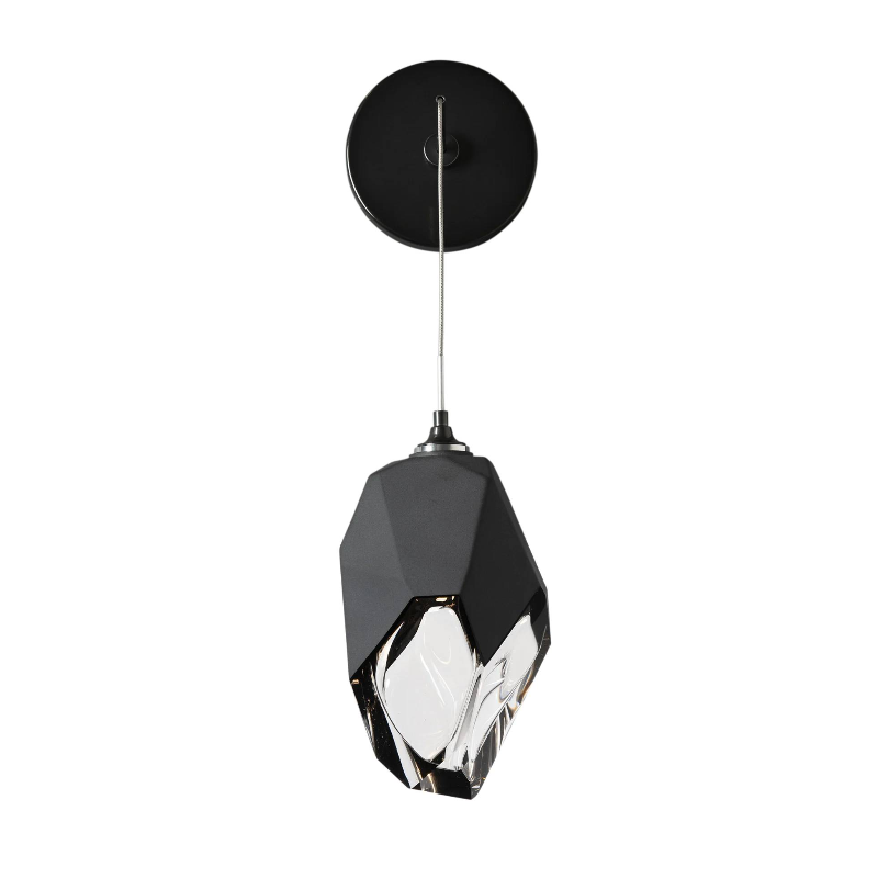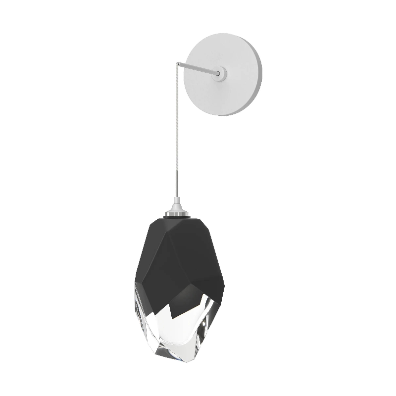 The Chrysalis Large Low Voltage Sconce features a large, handcrafted faceted glass crystal. You have the ability to set it at the drop height desired, creating unique opportunities for vanity, bedside and other applications. The Chrysalis’ trademark thick, clear layer of glass is encased in an outer layer of hand-blown, colored glass (matte black or white). Hand-polished like a gemstone, the lower portion of the outer layer of glass is removed to reveal the inner crystal clear layer below that is lit from within.