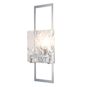A tall, open rectangular piece of steel holds a large clear, textured glass square panel giving the Geo Sconce an angular yet distinguished allure. Very geometric in design, with clean simple lines, the Geo adds a touch of modern style to any space.