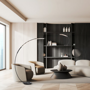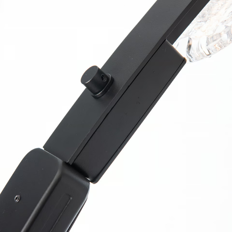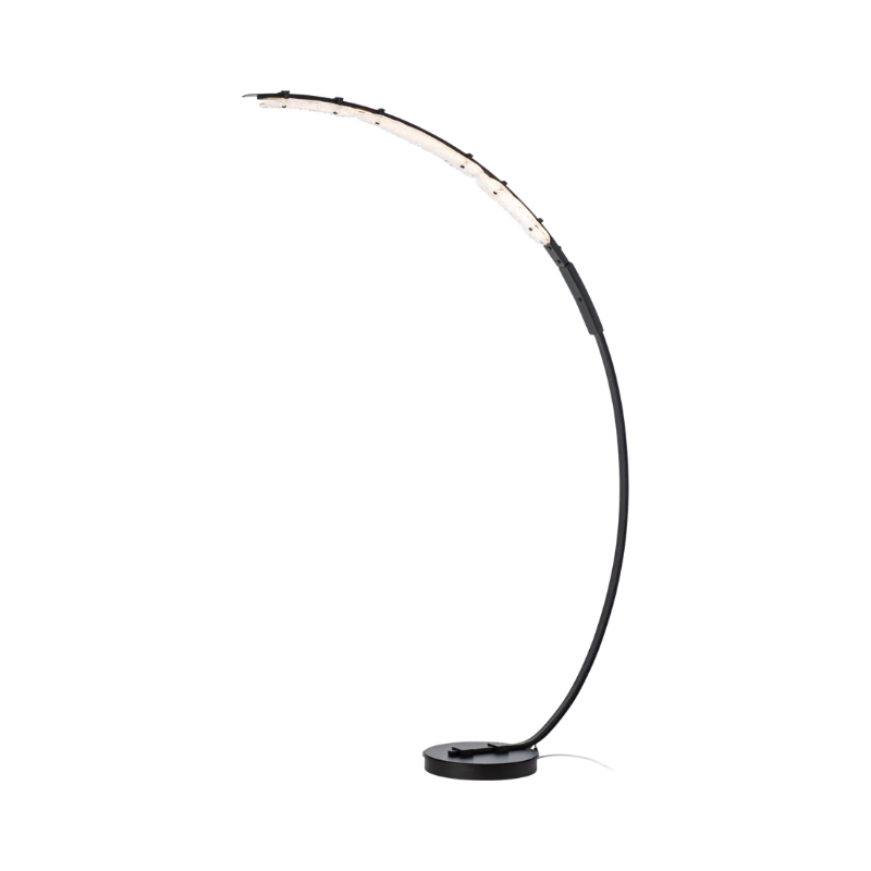 Three pieces of heavily textured handmade glass form the curved shape of the Glissade LED Arc Floor Lamp. "Walking across an icy pond in Iowa," said designer Andy Morter, "I was captivated by the clarity and natural geometry of the fractured pieces of ice where their jagged edges met the shoreline." A dimmer is perfectly located for easy access.