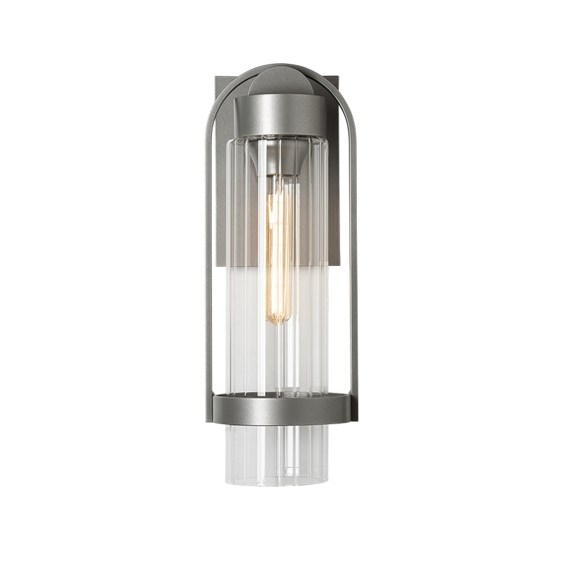 The Alcove Small Outdoor Sconce is a clean contemporary design that complements many architectural styles. The clear fluted glass disperses light in a subtle pattern, while the clean elemental forms made of hand-shaped aluminum are unified into a single, elegant form. This sconce is perfect for may outdoor applications where smaller-sized wall fixtures are optimal.