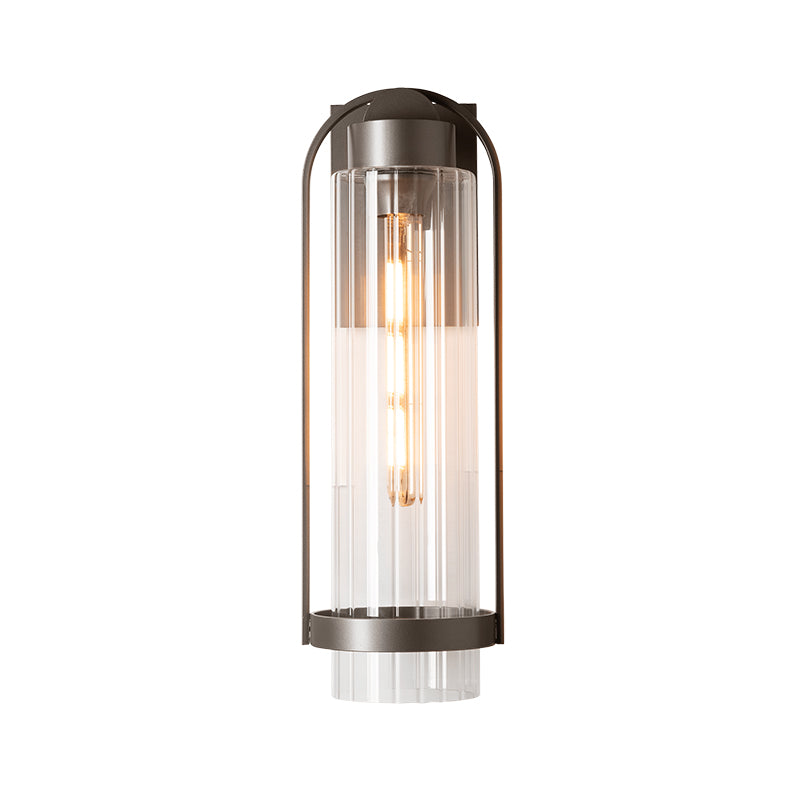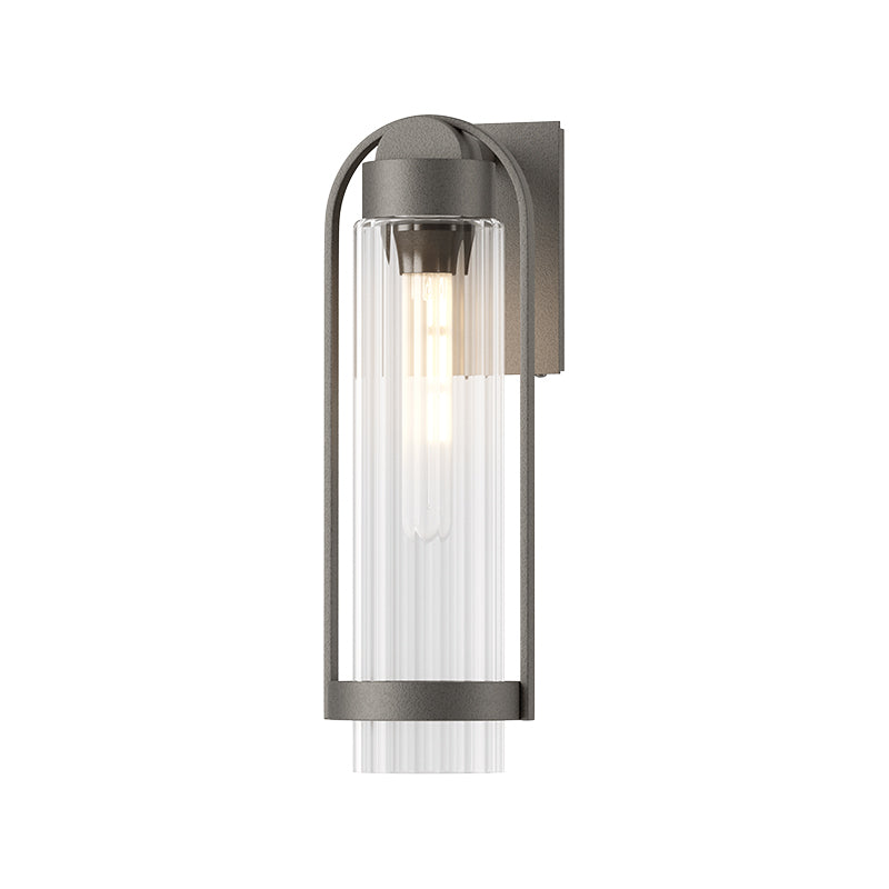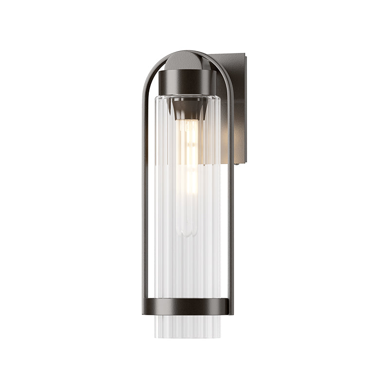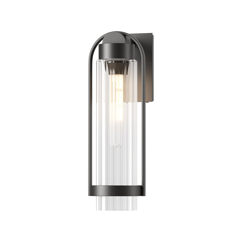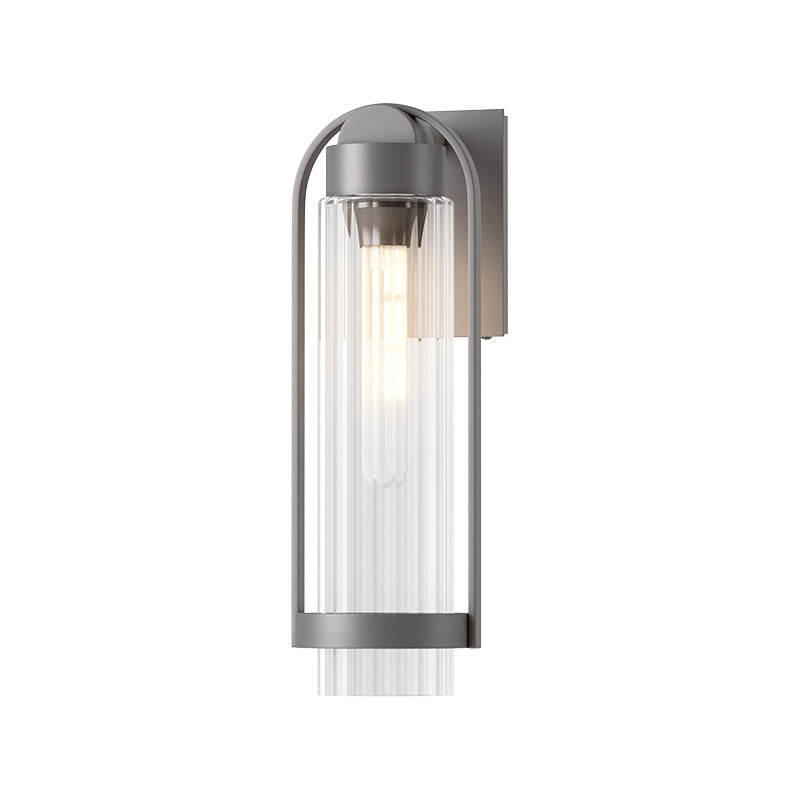 The Alcove Medium Outdoor Sconce is a clean contemporary design that complements many architectural styles. The clear fluted glass disperses light in a subtle pattern, while the clean contemporary elemental forms made of hand-shaped aluminum are unified into a classic silhouette for this mid-sized wall mounted fixture.