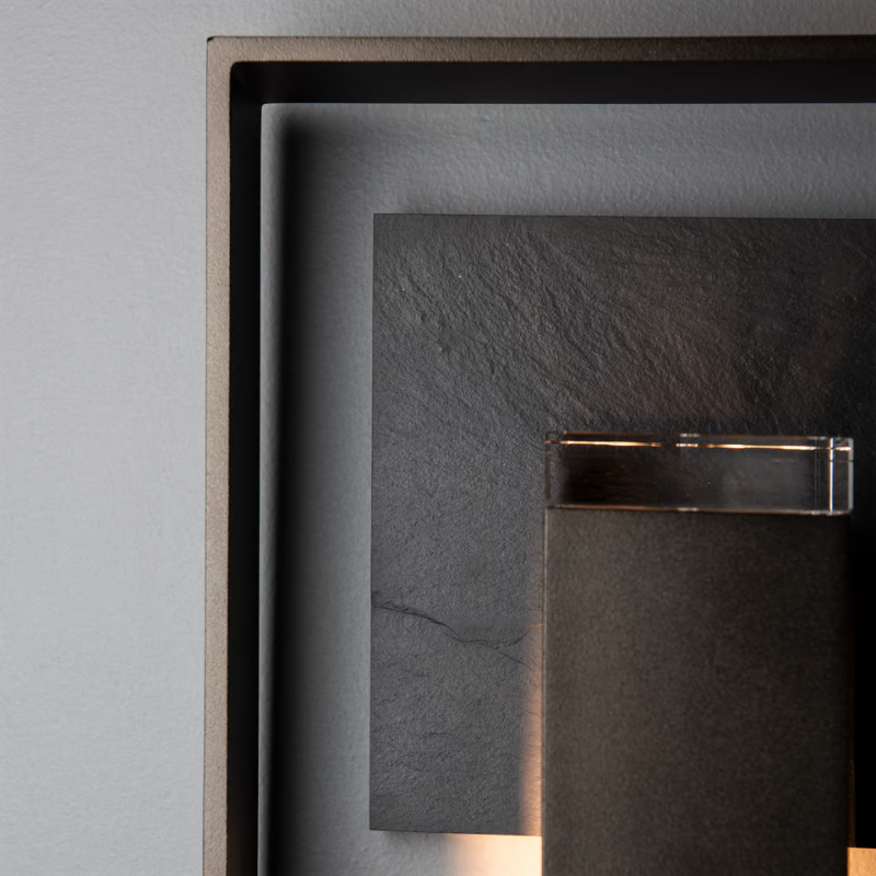 A Dark Sky Friendly version of our acclaimed Shadow Box outdoor fixture features an uplight inhibitor to help to protect our skies from light pollution. It offers a “sensual minimalism accentuated by the dramatic lighting”, according to Designer David Martin, and features a Vermont black slate backdrop in its square aluminum frame.