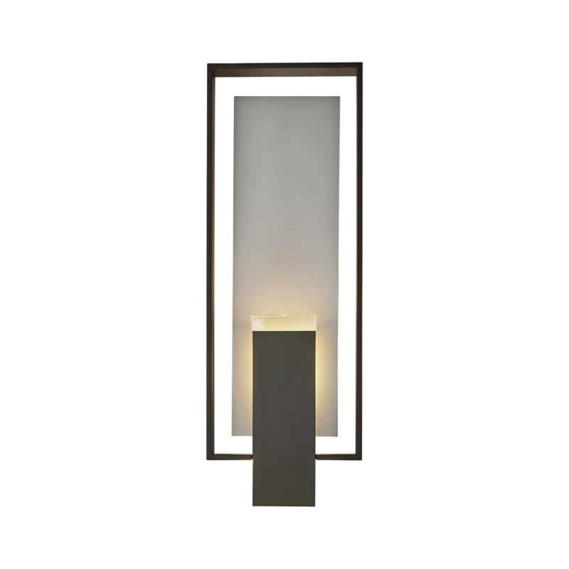 Layers of diffused light and dramatic shadow create the perfect blend of style and austere lines. By focusing on materials and faultless geometric balance, this large Shadow Box sconce makes a statement. This Dark Sky Friendly version allows us to truly appreciate the night sky's constellations by impeding uplight and directing the light downward. Offered as a two-toned wall sconce, with the frame being one finish and the backplate another, if desired.