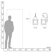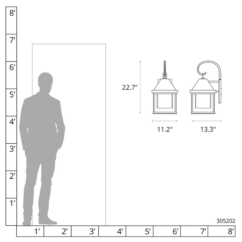 Designer Paul Marr Hilliard created the Dorset Outdoor Collection that balances traditional elements like the lantern shape and scrollwork with modern, minimalist lines. A gracefully curved scroll hook and loop at the top adds an elegant, decorative touch highlighting the Dorset's fine workmanship on this mid-sized exterior wall mounted Dark Sky Friendly sconce.