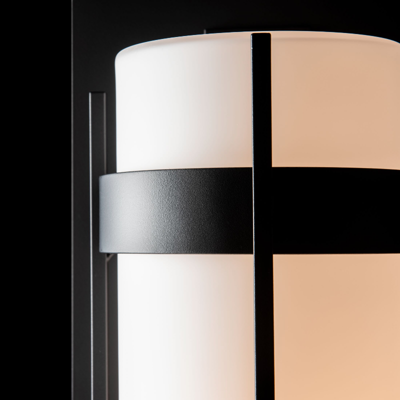 A clean, sleek design that evokes dreams of the Far East is the hallmark of our Banded Collection. True to name, our Grande-Sized Outdoor Sconce has two handcrafted metal bands, intersected by a vertical bar, circling the glass and fastening to the mounting plate.