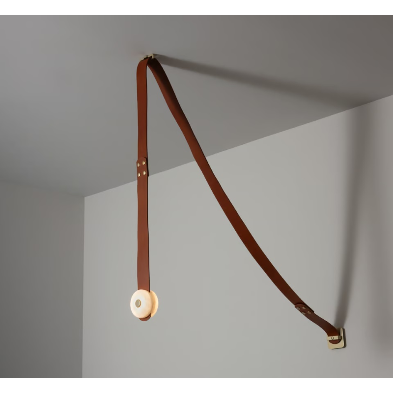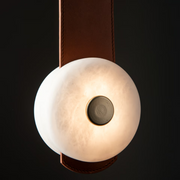 The SNAPS Small LED Pendant designed by HF's Andy Morter features a single alabaster stone-LED element on a long strap, with an additional, shorter fine-grain leather extension strap. An integrated "mini mount" allows a remote driver installation for a minimal wall mount appearance. Part of the ART + ALCHEMY by Hubbardton Forge Collection.