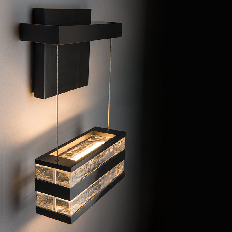 The Stacks LED Sconce is beautiful. Exceptionally clear glass is hand-poured to create thick blocks of glass that is sandwiched between layers of billet aluminum. LED light is encased in the metal, powered by conductive, low-voltage cables that extend from a metal frame above.