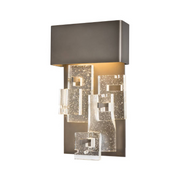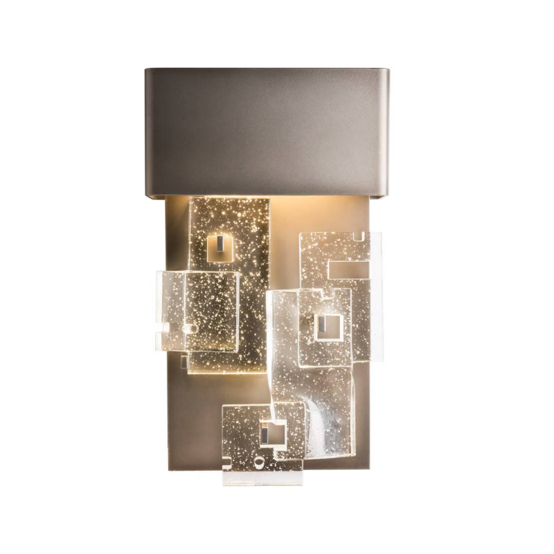 Add a touch of luxury to any room with the Fusion Small LED Sconce. It offers elegant and functional wall lighting at a versatile height of 16.4". Staggered layers of thick, clear, fused glass are displayed in a geometric pattern, on the fixture's aluminum backplate.