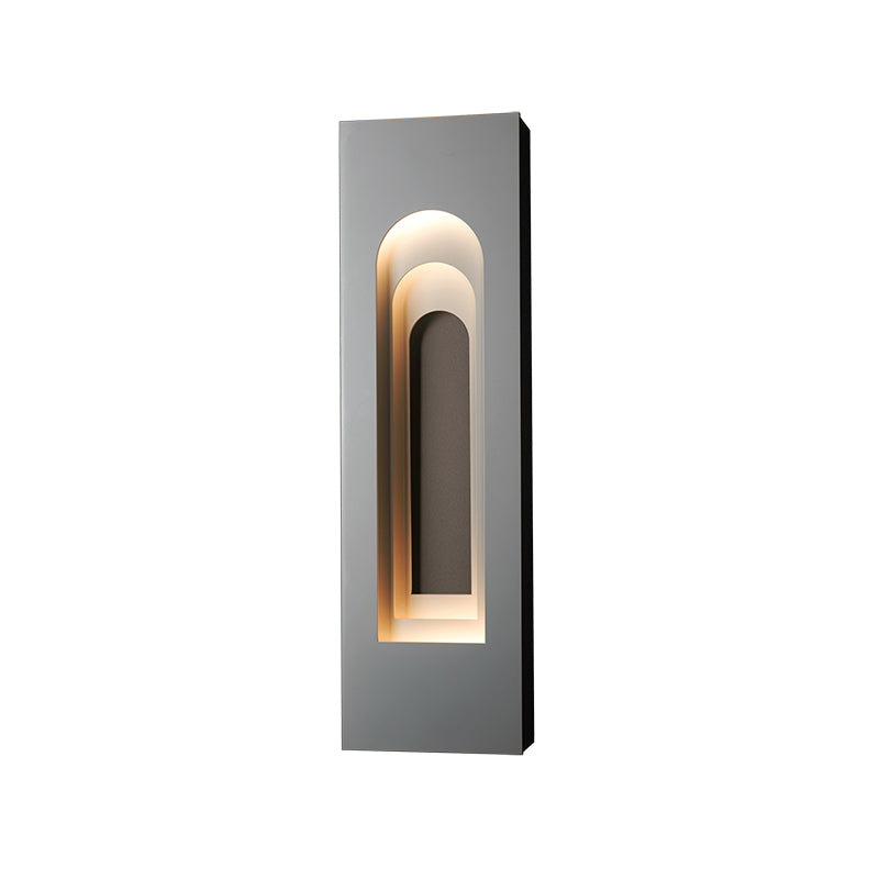 Inspired by a visit to the Grundtvigs Church in Copenhagen, the Procession Arch Small Outdoor Sconce takes the idea of spatial progression, utilizing forced perspective to achieve its timeless aesthetic. The original Gothic arch was transformed into a Roman arch in this aluminum wall-mounted sconce.