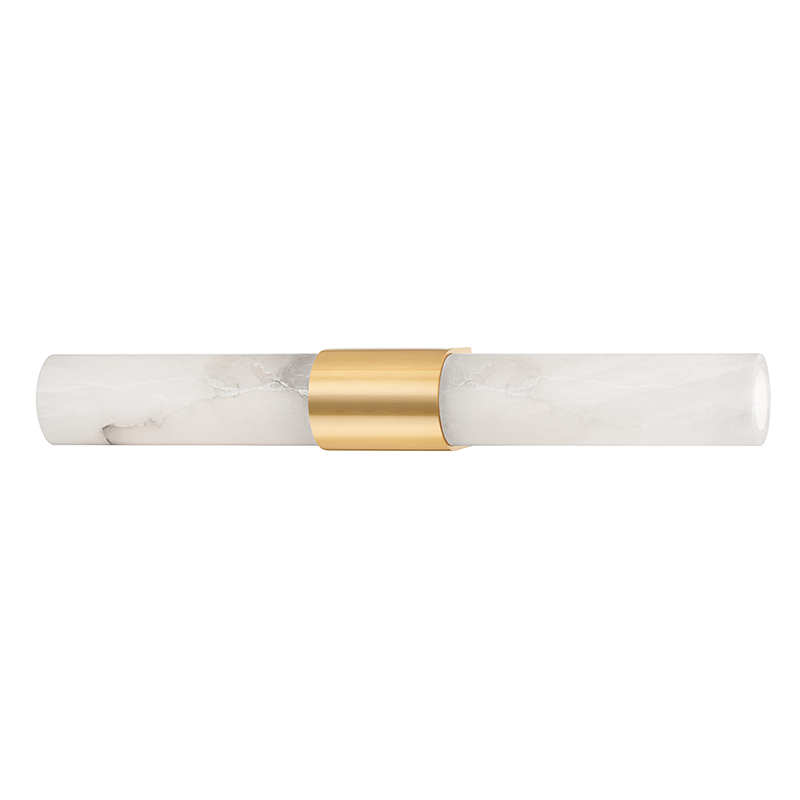 The very definition of minimalism, less is truly more with Ellington. The sculpted metal collar doubles as a backplate, attaching the sconce directly to the wall without the need for any additional adornment. The real focus of this fixture is the alabaster tube shade. Equally as beautiful unlit, the alabaster gives off a gorgeous, soft glow when filled with light. This smooth and stylish sconce comes in aged brass or polished nickel finishes.