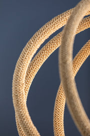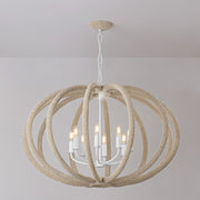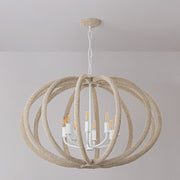 Intricately wrapped in white coconut shell beads, the enchanting Lewiston resembles an artifact pulled from the sea. Its gracefully looped arms form an oblong cage-like structure with a candle cluster nested inside.