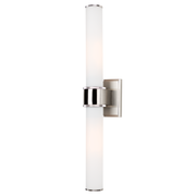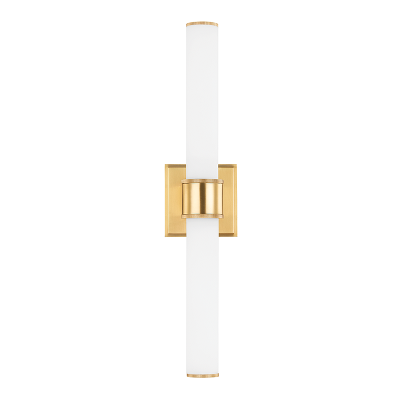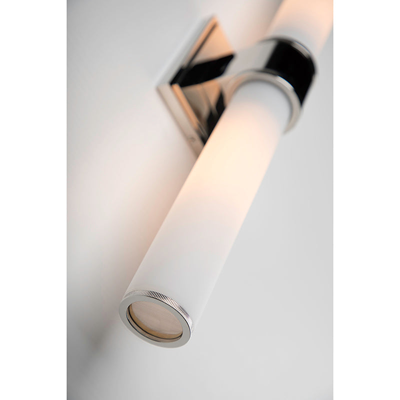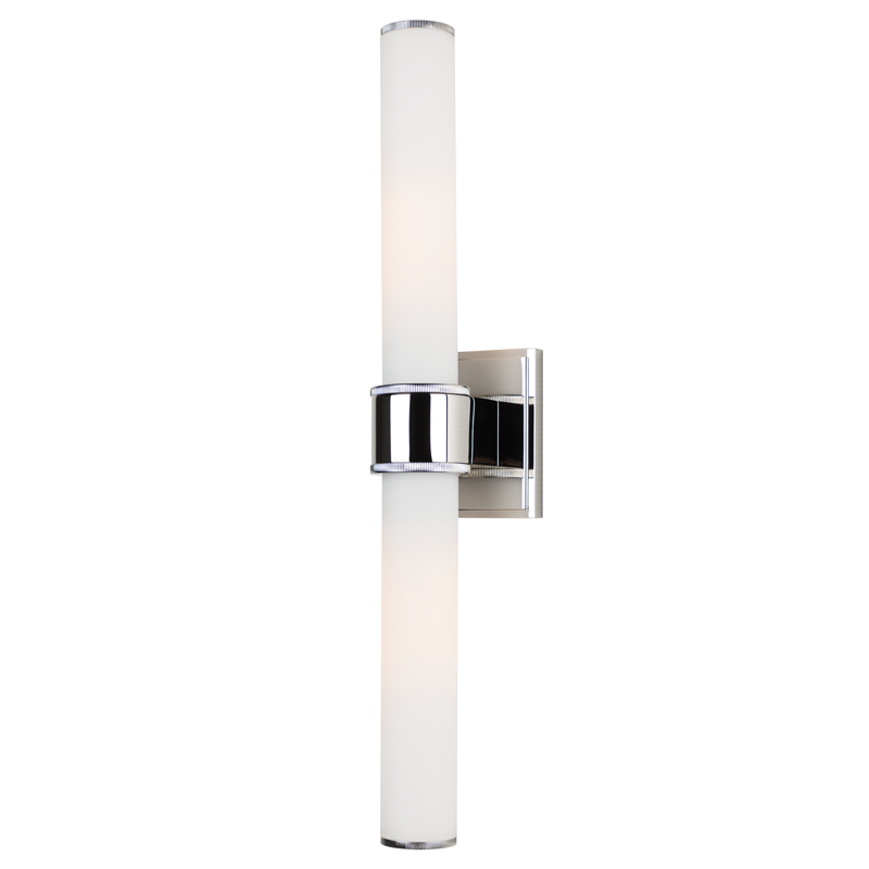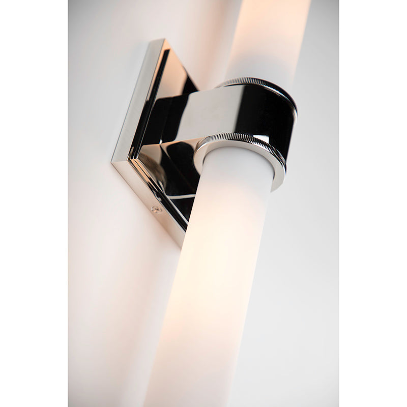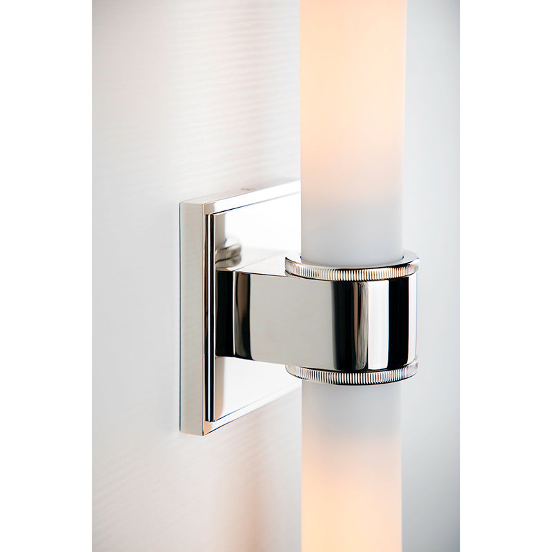 The subtle details are what make Mill Valley so special. Rings of knurled cast metal at the band and shade cap add texture, while the tiered, square baseplate adds dimension. Light diffuses through the opal matte glass creating a soft glow. This sleek fixture is not only beautiful in the bath, it adds style and shine wherever it goes. Designed to work in different spaces, the two light fixture can be mounted horizontally or vertically.
