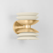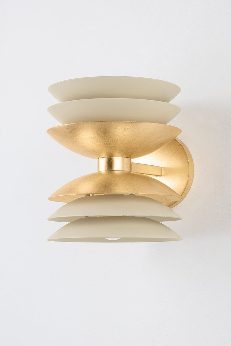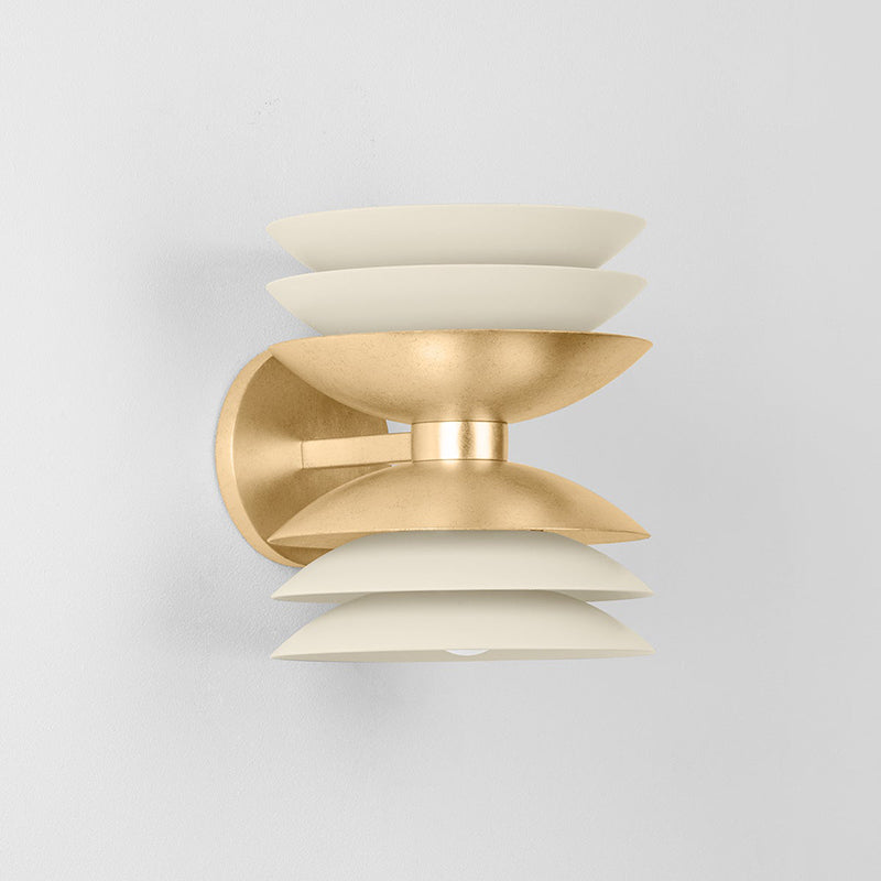 Exhibiting graceful symmetry, Oneida revives Art Deco principles with contemporary simplicity. Artfully layered tiers of Vintage Gold Leaf and sand-hued plates create a streamlined vision that guides the direction of light.