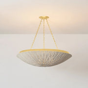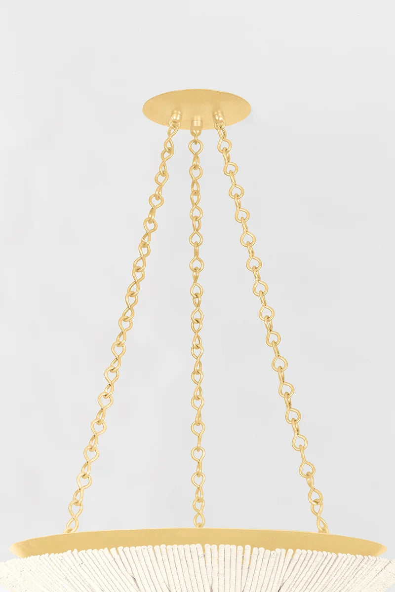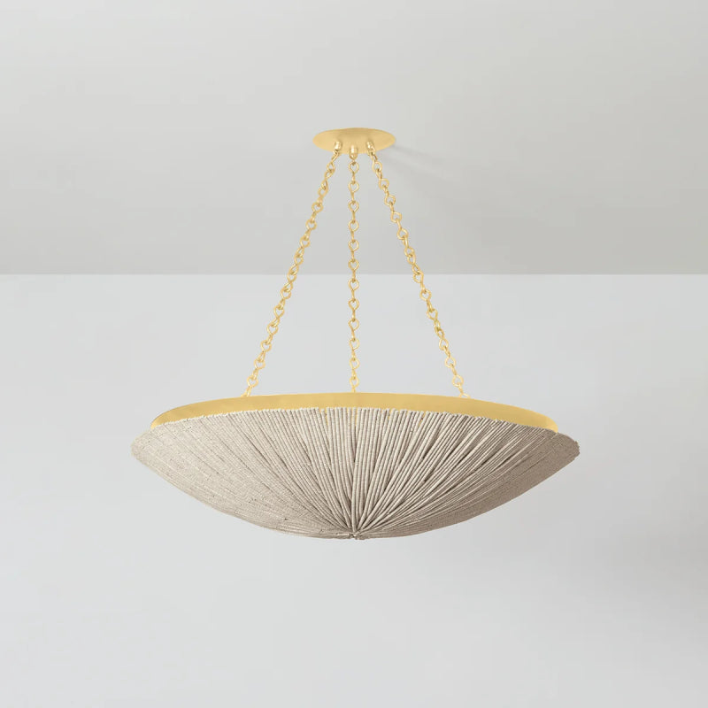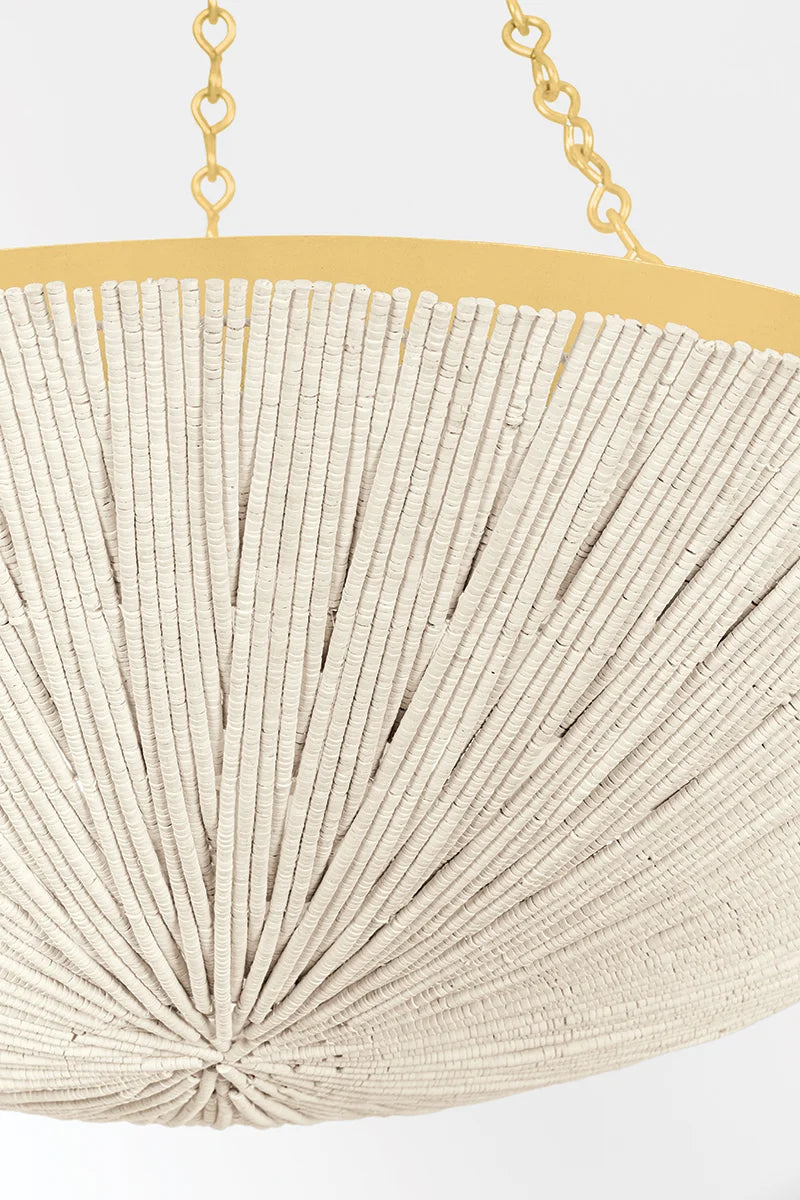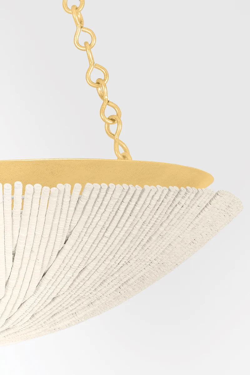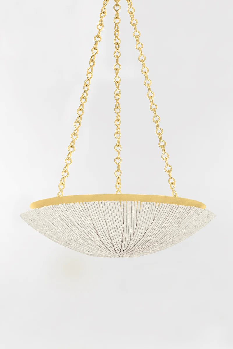 The sophisticated silhouette, ornate details, and mixed materiality of Summerside make for a truly majestic pendant light. The beautiful Coco Shell bowl on this fixture has been hand-beaded, creating a rich texture and visual dynamism. Stacked within this bowl, a Vintage Gold Leaf dish reflects light outwards, adding a tasteful material contrast.