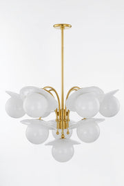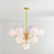 Rooted in the principles of Art Deco design, Stampford features large opal glossy globes topped with artisanal Piastra glass discs. Both celestial and organic, the striking formation resembles flowers in bloom.