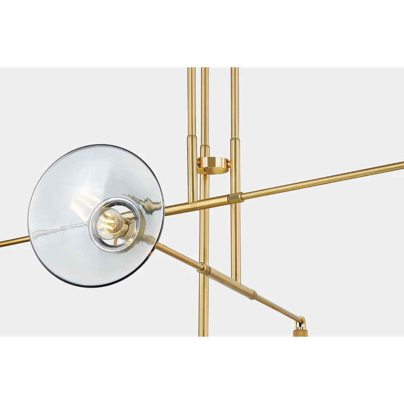 Taking an architectural approach to the mobile trend, Mendon features crisp, geometric details and distinctive gray glass. The overall composition is well-balanced, using asymmetry as a form of artistry. The thick glass shades are smoky and alluring, adding interest to the clean lines, while the Aged Brass finish strikes a warm note.
