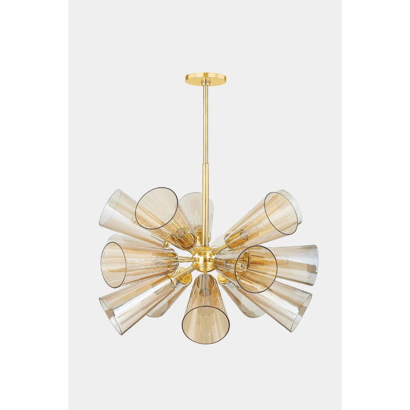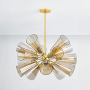 Hartwood brings a festive twist to a mid-century modern design. The clear hand-blown glass shades of this sputnik-inspired chandelier resemble a cluster of fluted glassware facing outwards. Light champagne plating on the glass combined with Aged Brass metalwork accentuates the effervescent energy.