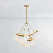 Balancing hard and soft elements, Duxbury creates a modern architectural lighting experience inspired by morning dew collecting on blades of grass. Voluminous cloud seedy glass shades are suspended from stark metal bands and chains, creating a powerful yet pleasing contrast.