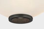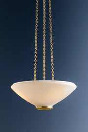 The traditional silhouette of the Awosting pendant receives a fashionable update with jewelry-inspired details. Blown from opal matte glass, the shade’s softened edges evoke a sense of calm, organic beauty. As light passes through the oculus, the lace-like metalwork becomes more noticeable. At the top, a trio of delicate vintage-inspired chains supports the shade.