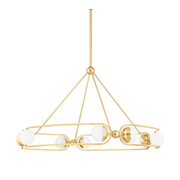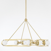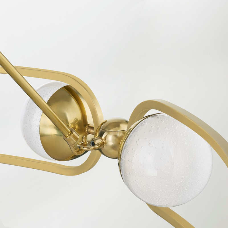 Hartford starts with the open, streamlined form of a round chandelier and updates it through on-trend material. A series of glass globes capped in Aged Brass and set at opposite ends of an open cylindrical frame form the airy, jewelry-inspired silhouette. The globes are made of a unique fizz glass, a dense bubble glass that is stunning when lit.