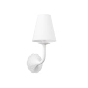 Inspired by a flower in bloom, the charming Winnipeg sconce features delicate scalloped edges and a tailored silhouette. The botanical backplate swoops elegantly upwards to cradle the light source, which glows through a tapered white linen shade.