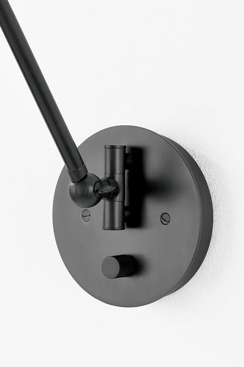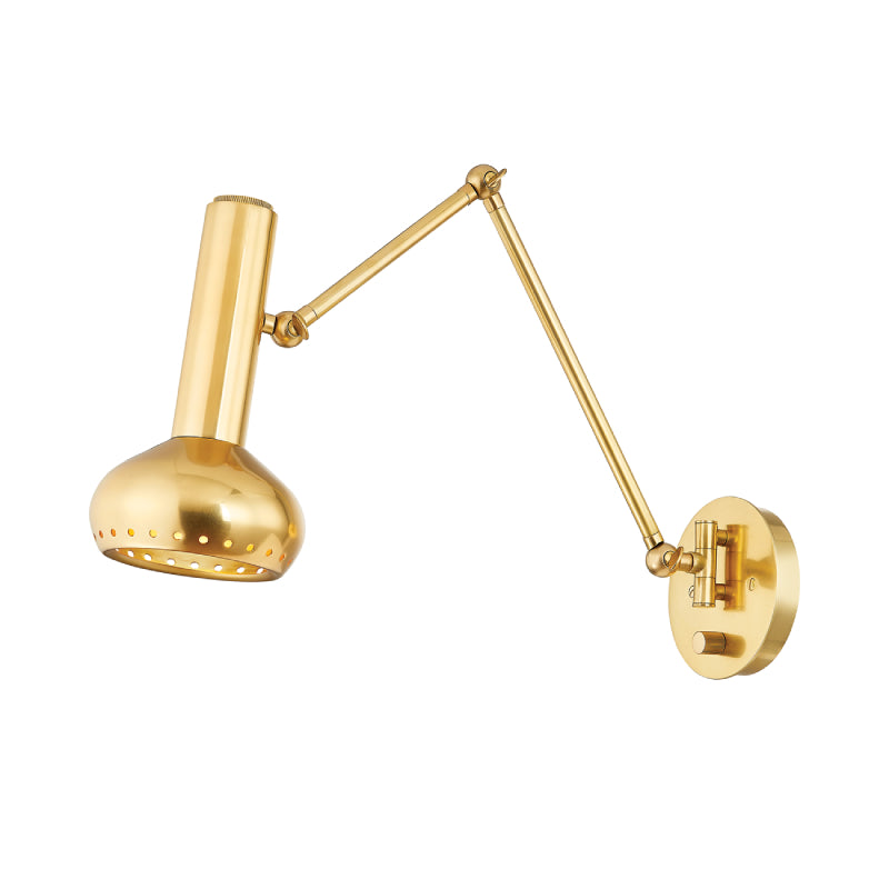 The atomic curves, metal detailing, and slender, adjustable arm of Roald nod to its mid-century inspiration. Ideal as a reading light in a bedroom or office, this versatile sconce features a gourd-shaped shade with decorative perforations.