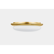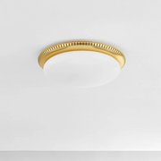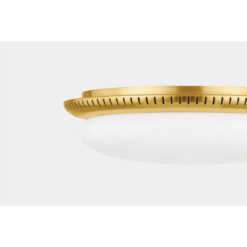 A Deco-inspired flush mount positioned directly on the ceiling to provide optimal overhead illumination. The large opal shiny glass shade is accented by an Aged Brass mount with even perforations for added style.