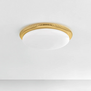 A Deco-inspired flush mount positioned directly on the ceiling to provide optimal overhead illumination. The large opal shiny glass shade is accented by an Aged Brass mount with even perforations for added style.