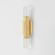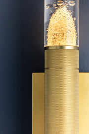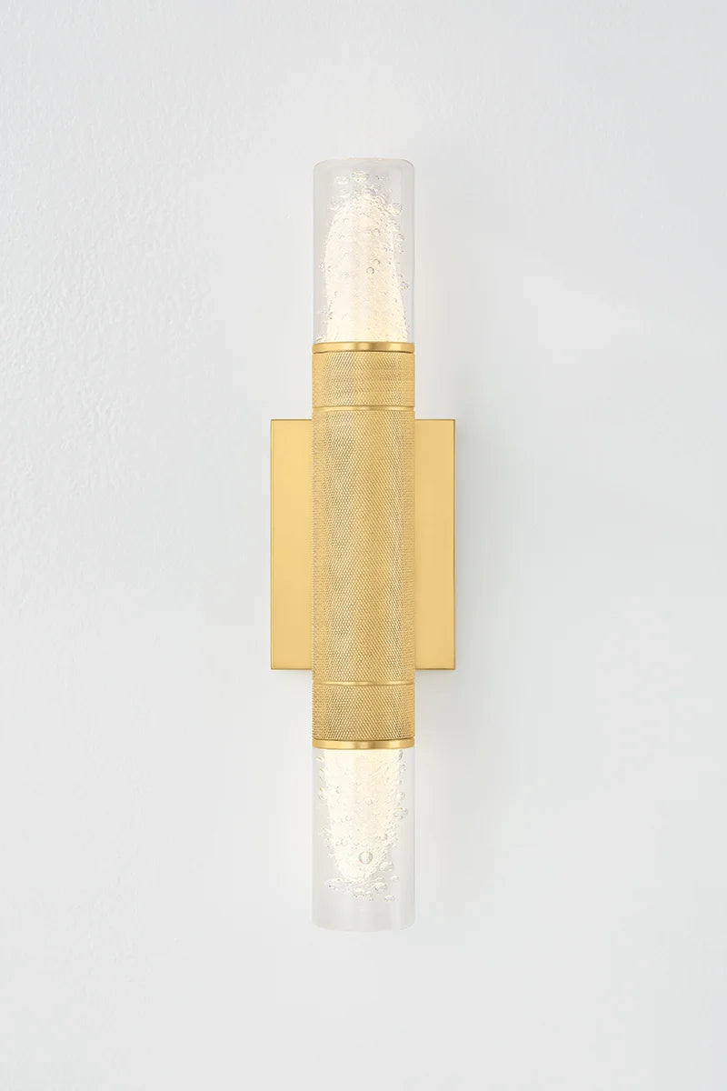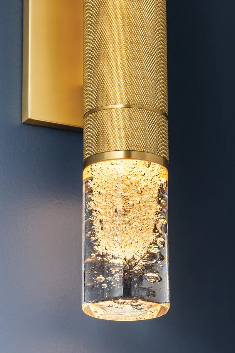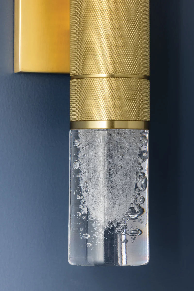 Glen Cove is a petite wall sconce that combines a graphic silhouette with specialty glass. The central metal stem, finished in Aged Brass, features distinctive knurling for added texture. Clear-seeded glass shades are positioned at both ends of the stem, allowing light to radiate in every direction. Glen Cove serves as both a decorative and functional fixture, perfect for use alone or in multiples.