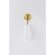 Reminiscent of a drop earring, the layered glass shade of Clarkstown hangs from a dainty circular looped chain. The domed, unadorned canopy allows the special quality of the chain and glass to shine. Decorative pins enhance the jewelry-like quality of this sconce. *Fixture may only be installed as shown in picture.