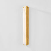 A modern ‘air lantern’ design with a bold architectural silhouette. In lieu of a central light source, LED strips are integrated into the cage of Edgemere itself. A rectangular panel of alabaster is attached to each arm, creating a geometric array of light within the piece.