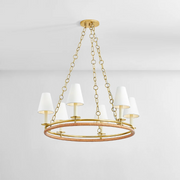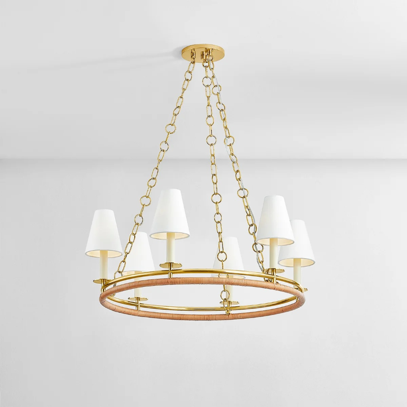A distinctive double-ring chandelier presents the opportunity to play with mixing materials. As if in conversation, the upper ring of Swanton is finished in sleek Aged Brass, while the lower is cleanly wrapped in natural rattan. *Due to the one-of-a-kind nature of the medium, exact colors and patterns may vary slightly from the image shown.