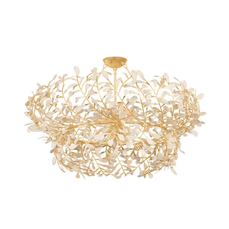 Graceful, scrolling ‘vines’ with delicate coco shell ‘petals’ wisp around to create the nest-like silhouettes of the Maybrook family. The organic beauty of the carved coco shell is paired with a Vintage Gold Leaf finish in this glamorous ode to nature.