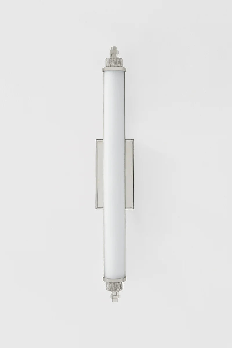 Designed for bath and powder rooms, Plandome is a sleek, machine-inspired sconce with high functionality. Featuring a single LED-lit opal matte glass tube supported by a central stem, this slender fixture can be used individually or in multiples as needed.