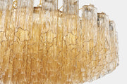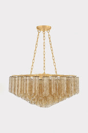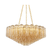The incredible quantity of layers, lights, and complex glass shapes make Watertown a dramatic showstopper. Inspired by Art Deco aesthetics, this maximalist chandelier features organically shaped Tronchi glass shades with textured cuts.
