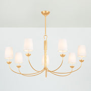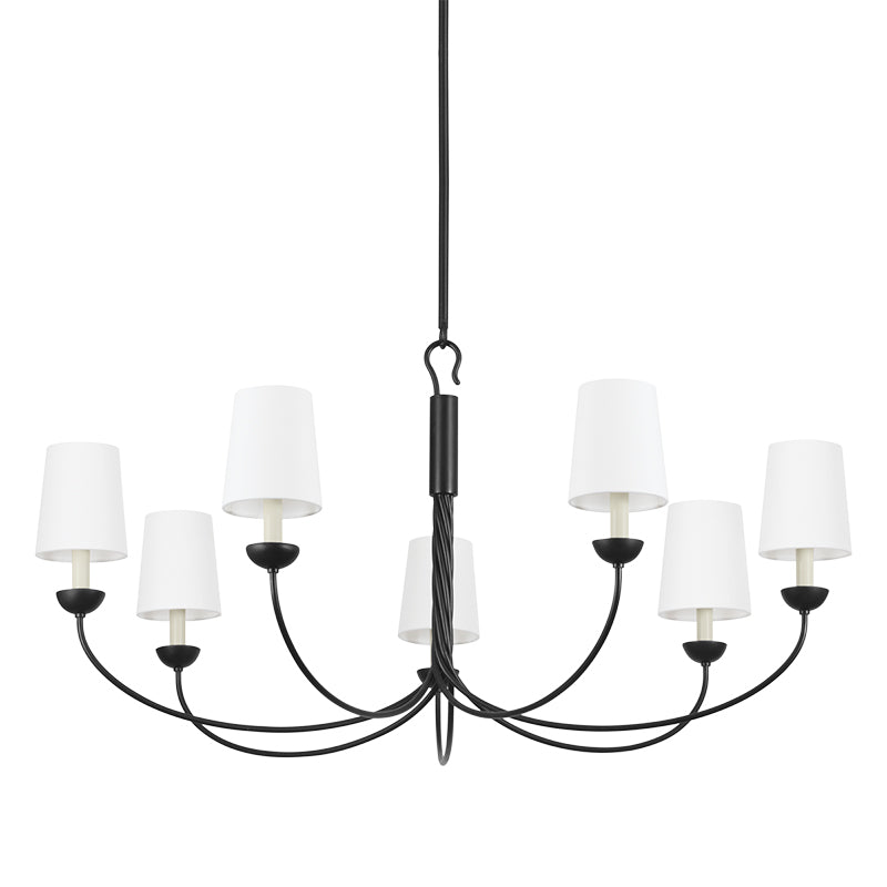 Stylish in its simplicity, the Montpelier chandelier features 7 candle sleeves topped with tapered white linen shades. A twisted central rod and distinctive hook-and-ring detail offer graceful support to the curved arms of this timeless silhouette.