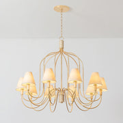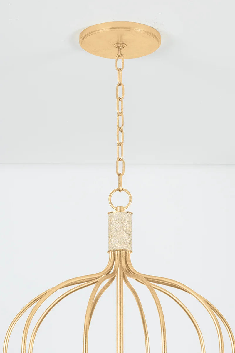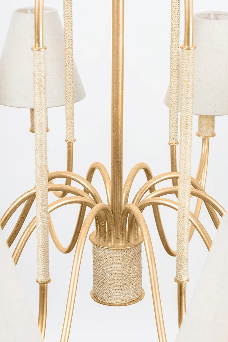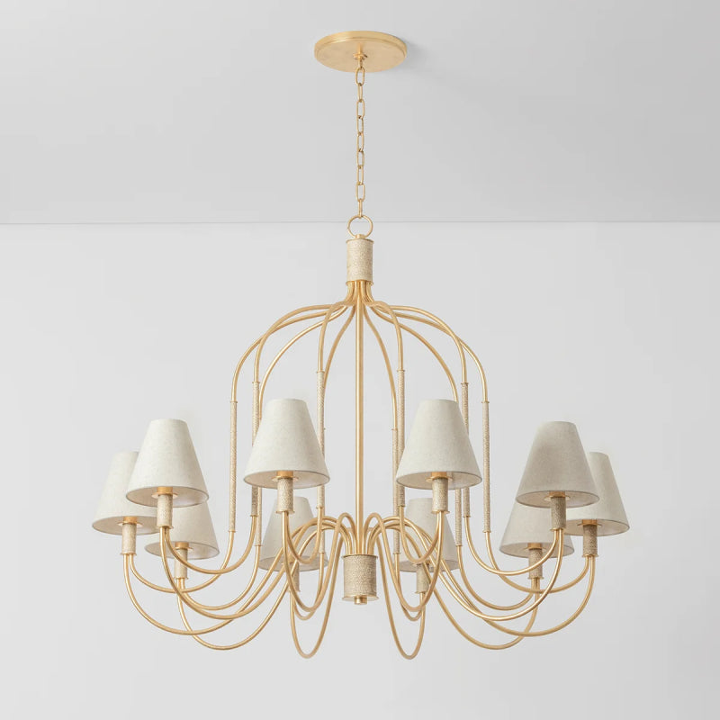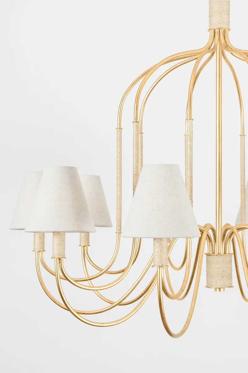 The Parisian-inspired designs of the Warrensburg family channel vintage motifs for a fresh take on romantic lighting. The intricate swooping metalwork recalls the shape of an antique carriage, enhanced by the glamorous Vintage Gold Leaf finish. Subtle Abaca-wrapped details and linen shades add natural, artisanal elements.