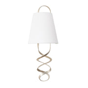 Dota's gorgeous flowing lines are the highlight of this playful yet elegant sconce. Curved metalwork in Vintage Gold Leaf or Warm Silver Leaf twists and swirls in a tranquil loop that draws the eye and creates an open, airy spiral silhouette against the wall. The tapered white linen shade grounds the design and adds a traditional element that makes the piece extremely useable.