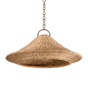 Inspired by the tranquility of the sea, this handwoven pendant light provides ambient illumination day and night. Combining rustic materials, a conical rattan shade is suspended from a large Bronze Leaf loop and chain. Serving as a powerful downlight, it brims with contemporary character and functionality.