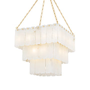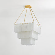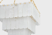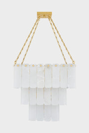Inspired by Art Deco design, this grand chandelier features three tiers of lustrous cascading alabaster panels. Cool and milky when unlit, the subtly translucent alabaster comes to life with a warm glow when illuminated. Enhanced with Aged Brass finials and suspended from an elegant chain, Moissanite exudes an old-world sense of glamor.