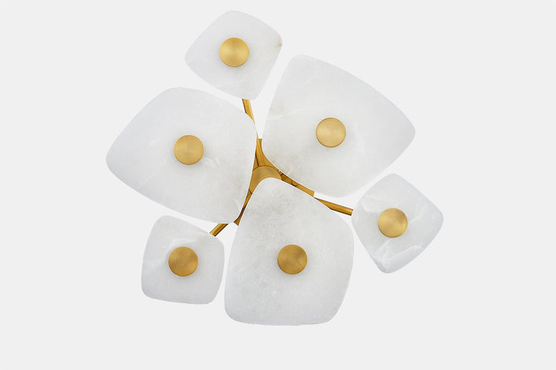Marrying artistry with innovation, slabs of natural alabaster are illuminated by LED technology in this enchanting fixture. Supported by an Aged Brass framework, each alabaster shape is entirely unique, enhancing the bespoke nature of the composition.