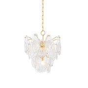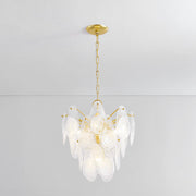 Smooth Blonchino Piastra glass teardrops are suspended in tiers from the waterfall-like Darcia. Reminiscent of shells or falling rain, the hand-blown glass pieces sparkle as they soften and diffuse the light.