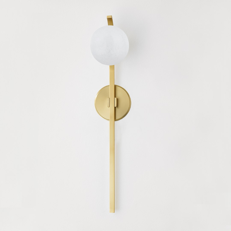 Nuage glass globes are the highlight of this modern statement sconce. Clear glass globes are etched on the inside creating a speckled opal glass interior that produces an understated yet gorgeous lighting effect. The globes are displayed on slender, curved arms in Aged Brass for a striking silhouette.