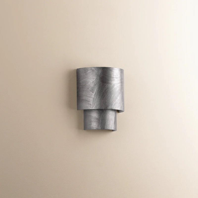 The architectural Moray sconce features a two-layered design with a unique texture. Two metal panels curve away from the wall to form the slightly nested, minimalist shade shape.