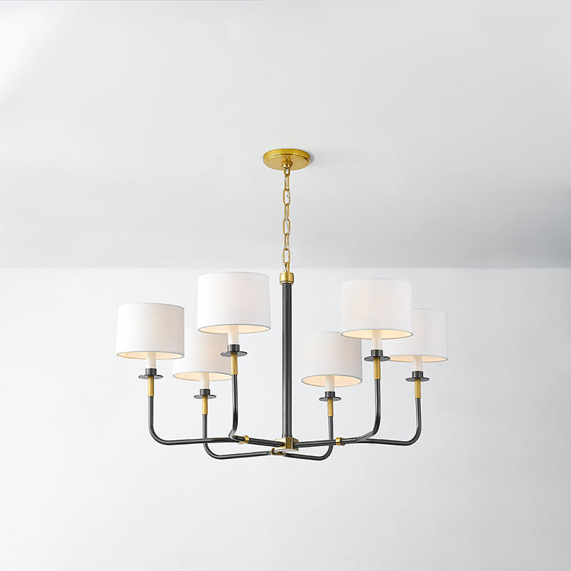 As either a chandelier or sconce, Paramus takes traditional elements, like arm and shade shape, and updates them by playing with scale. Elongated arms extend upwards to support candle sleeves topped with white linen drum shades.