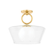 Soft flowing edges and gentle symmetries define this pleasing glass pendant. The clear shade reveals an inner cloud glass bulb, resulting in an even, unobstructed spread of soft illumination. Suspended by an elevated Aged Brass ring and canopy, Elmsford is an instant classic.