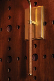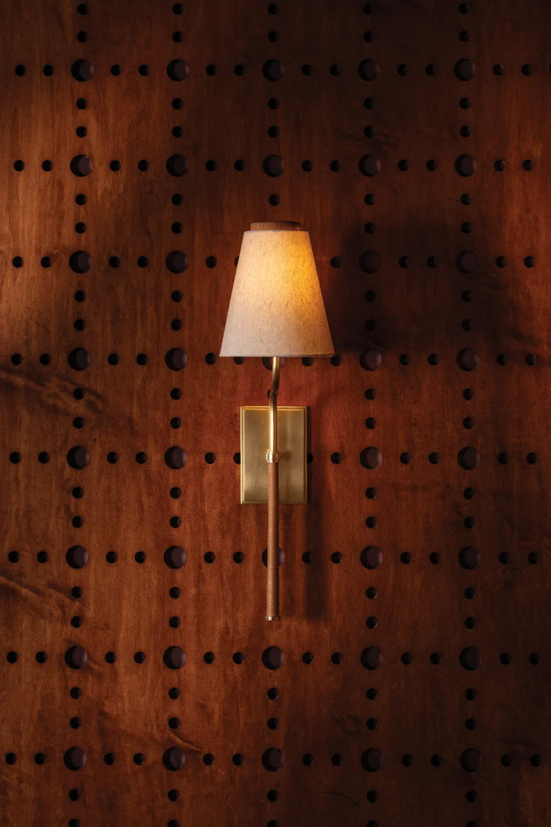 Tailored, yet relaxed, the Sullivan sconce blends texture-rich natural linen and rattan. The unique curvature of the stem provides a graphic detail, elevating the simple design with graceful lines. An Aged Brass finish on the metalwork balances the tactile materials. Alone or in multiples, Sullivan is a pleasing addition to hallways, bedrooms, bookcases, and powder rooms.