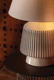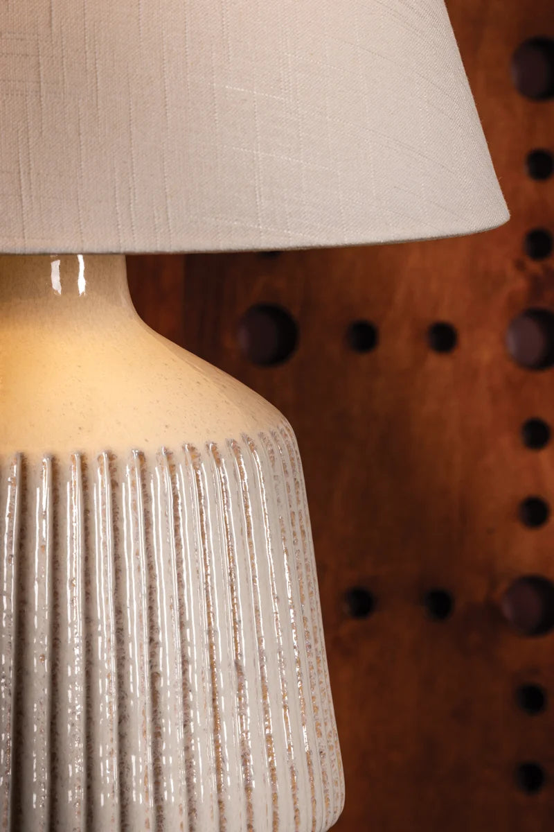 The architectural form and artisanal materiality of the King table lamp engage in a quiet dialogue between lightness and pattern. The Cocoon Ceramic base is accented by symmetrical ridges that add depth and tonal variation. A textured linen shade tops the lamp with even more earth-toned comfort while the Aged Brass hardware adds a glimmer of metal at the neck. King sits proudly in living rooms, studies, or bedrooms, providing a sculptural and grounded ambiance.